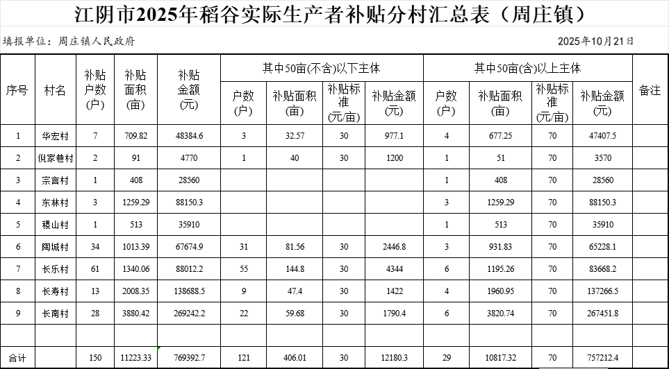 江阴市2025年稻谷实际生产者补贴分村汇总表(周庄镇)