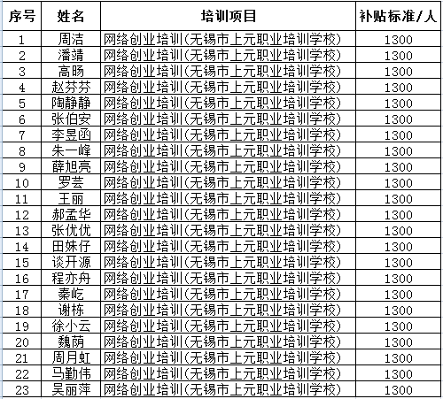 根据《关于进一步完善就业技能培训补贴申领审核操作办法的通知》锡人社发〔2019〕101号文件精神,经过审核共有23人次符合补贴条件,现将名单公示如下: