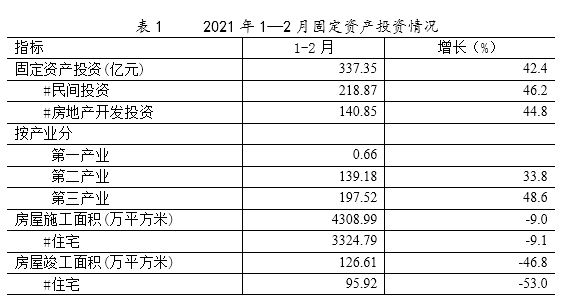 2021年1-2月份,全市固定资产投资337.35亿元,同比增长42.4%。房地产开发投资140.85亿元,同比增长44.8%。其中,住宅投资为122.34亿元,同比上升51.5%。