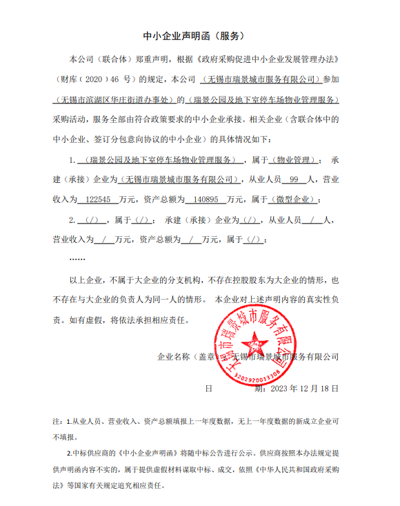 | 1 | 瑞景公园及地下室停车场物业管理服务 | 详见采购文件 | 1 | 年 | 投标总报价(小写):1371928.32(元) | 无锡市瑞景城市服务有限公司 | 无锡市滨湖区金融一街10号无锡金融中心19楼 | 9132021159857952XH |