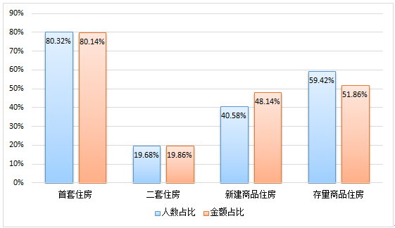 从贷款群体来看,刚需与改善型住房需求职工分别占贷款总人数的19.49%和69.98%。从单位性质来看,以城镇私营企业及其他城镇企业职工为主,贷款笔数和贷款金额占比分别为55.49%、53.38%。从购房面积来看,职工贷款购买90(不含)-120㎡房屋居多,占贷款总人数的42.75%。从主借人缴存基数来看,贷款主要以中、低收入职工为主,分别占贷款总人数的27.11%、71.63%。从贷款类型来看,纯公积金贷款和组合贷款占比分别为86.43%、13.57%。从贷款结构来看,首套住房公积金贷款职工占贷款总人数的80.32%,二套住房公积金贷款人数占19.68%。具体放贷结构如下: