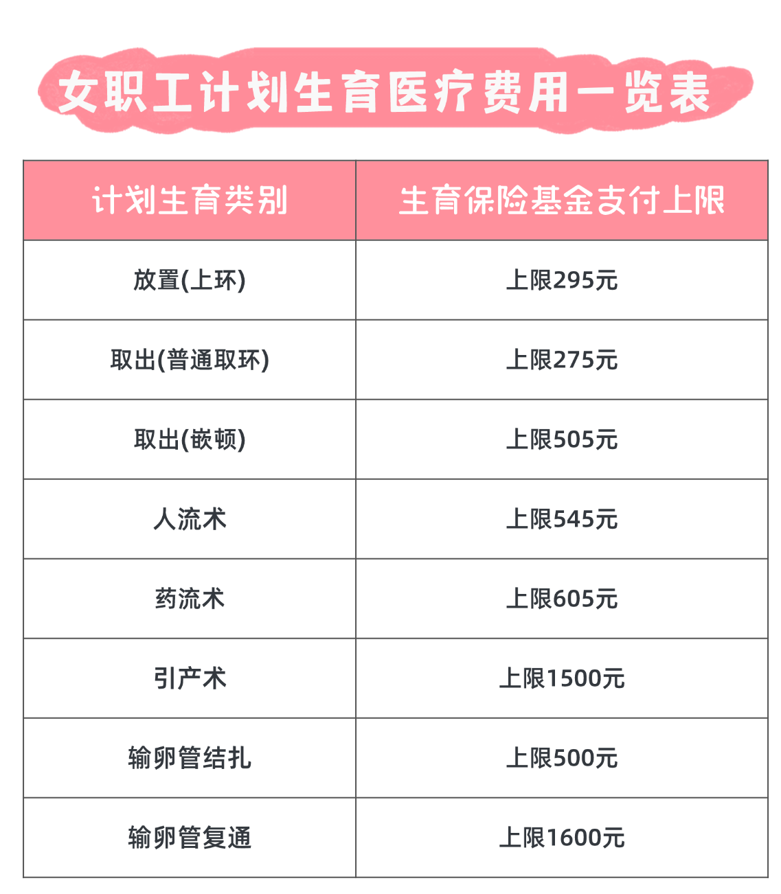 (3)计划生育医疗费:女职工实施放置或者取出宫内节育器、人工流产术或者引产术、输卵管结扎以及复通手术等,所发生的符合生育保险规定的医疗费用,以及在手术和住院期间,因实施计划生育手术引起的并发症的医疗费用。